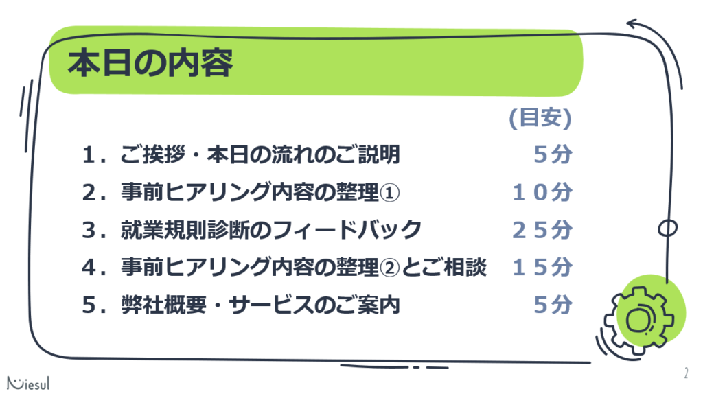 今回のサービスは、現在お使いの就業規則が「法改正に対応できているか」「会社の実態や守りたいルールに沿っているか」を点検することを目的に、約60分間のオンライン面談形式で行いました。