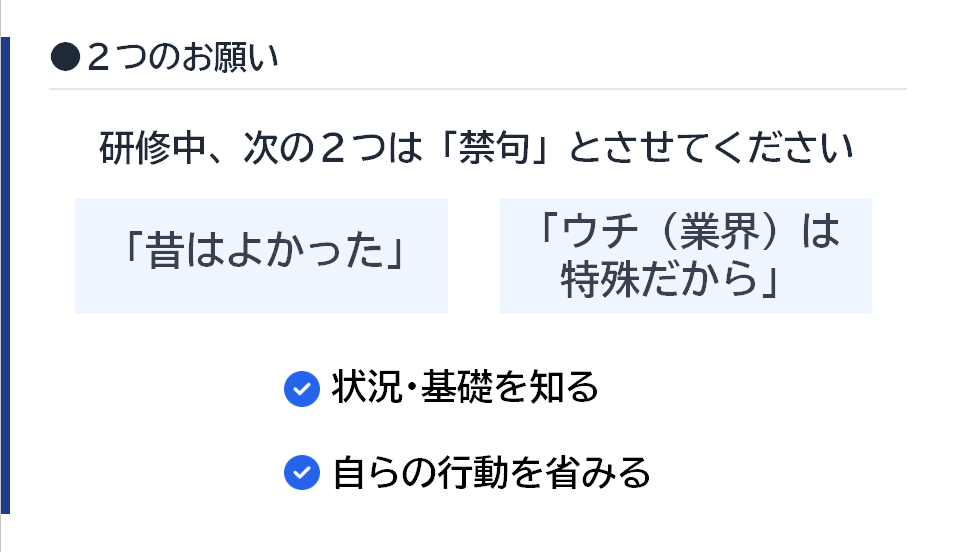 また、研修の冒頭では「昔はよかった」「ウチの業界は特殊だから」という言葉を「禁句」とするルールを共有しました。過去の価値観や業界の慣習にとらわれず、今の時代の基準を正しく知ることで、自身の行動を客観的に振り返る貴重な時間となりました。