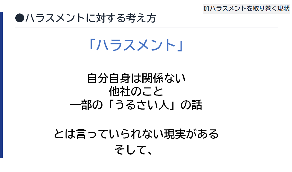 先月実施した役員・管理職層向けの研修に続き、今回は一般社員のみなさまを対象とした研修です。より良い職場環境を全員でつくっていくため、対面形式(企業さま会議室)にて1時間のプログラムを行いました。