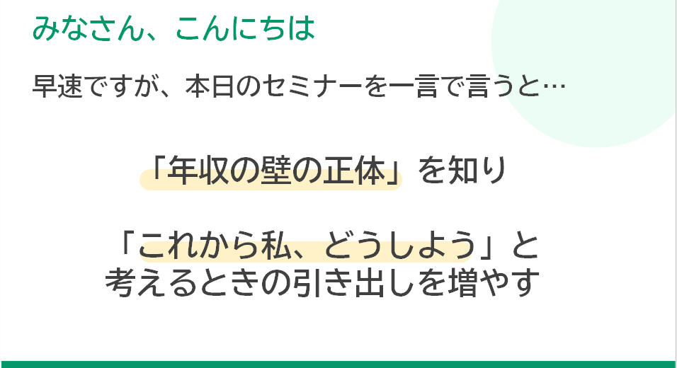今回のセミナーは、複雑な制度の「正解」を押し付けるのではなく、「年収の壁の正体を知り、これからどうしよう?と考えるときの引き出しを増やす」ことを大切に企画しました。